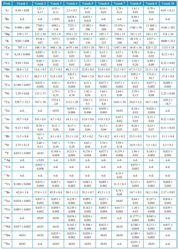 Detailní hodnoty pro všechny prvky ve všech vzorcích jsou uvedeny v tab 3. Zachovány jsou i hodnoty n.d. (nedetekováno) či ≤0,01 µg/L (pod MDL).
