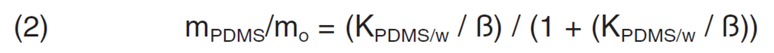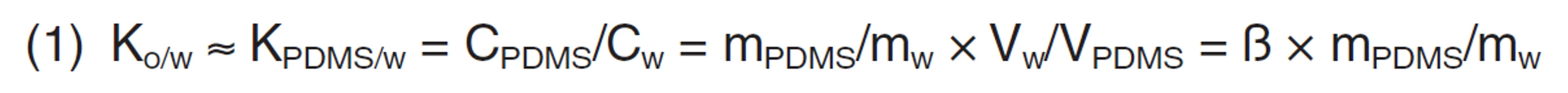 Rozdělovací koeficient mezi PDMS a vodnou fází (Kpdms/w) je definován jako poměr mezi koncentrací analytu v PDMS fázi (Cpdms) a koncentrací ve vodě (Cw) v rovnovážném stavu. Tento poměr je roven poměru množství látky v PDMS (mpdms) k množství tohoto analytu ve vodné fázi (mw) násobeno fázovým poměrem (kde odpovídá Vw/Vpdms). {3,5}. (Viz rovnice (1))
