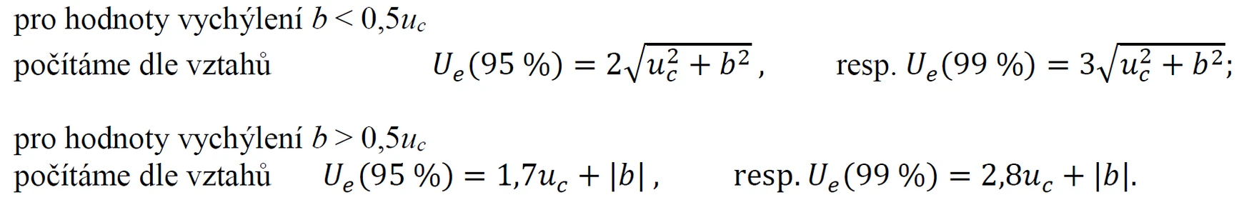 Hodnotu vychýlení porovnáme nejprve s kombinovanou standardní nejistotou a pak dle zvolené pravděpodobnosti pokrytí vypočteme hodnotu 𝑈𝑒(P %) dle příslušného vzorce: